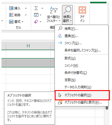 図形の数が多い場合は、「ホーム」タブの「検索と選択」から「オブジェクトの選択」を使う方法が便利です。
