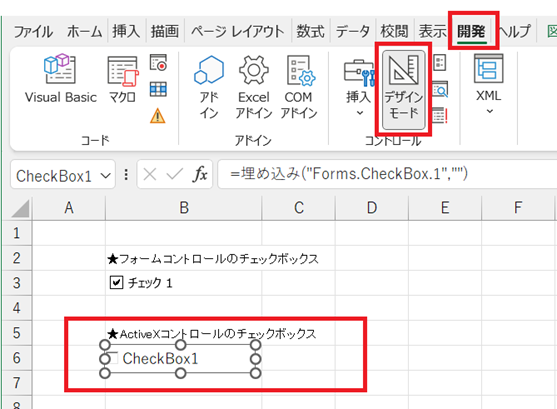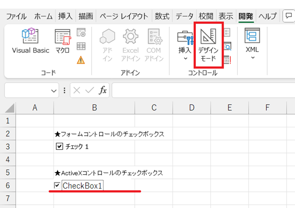 つまり、チェックを付けるためには「開発」タブより デザインモードをOFFに切り替えるのがポイントです。