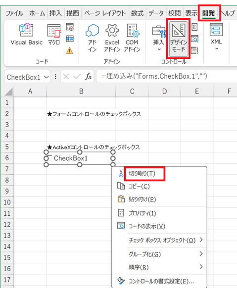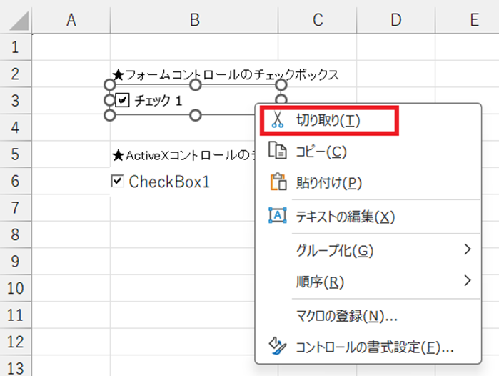 「□Check Box1」を選択し、右クリックメニューから「切り取り」を選択するか、キーボードの Deleteキー を押してけしましょう。