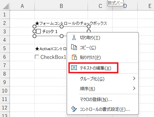 ・フォームコントロール → チェックできない場合は「選択状態」になっているのが原因。削除や編集は右クリックから可能。