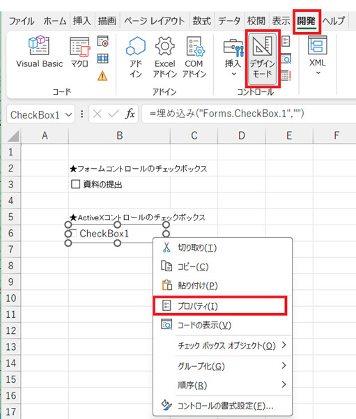 つまり、チェックを付けたいなら「開発」タブからデザインモードをOFFに切り替えるのがポイントです。