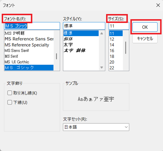 ここではフォントを「MSゴシック」、サイズを「11」にしてみます。