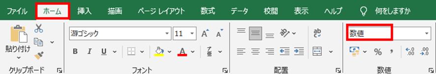 「ホーム」タブの「数値」グループにあるドロップダウンメニューをクリックすると、現在の表示形式が確認できます。