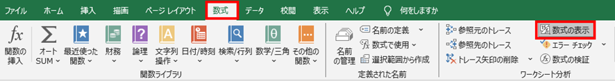 「数式」タブをクリックし、「数式の表示」ボタンが押された状態(ハイライト表示)になっていないかチェックします。