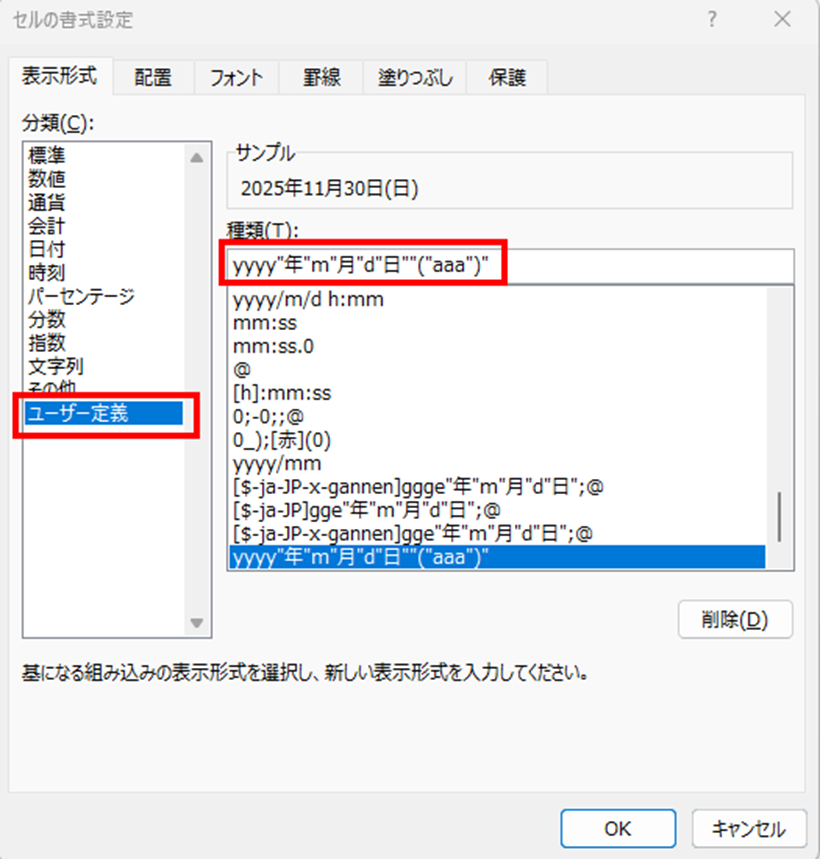 例えば、「2025年1月15日(水)」のように表示したい場合は、以下のようなユーザー定義を設定します。