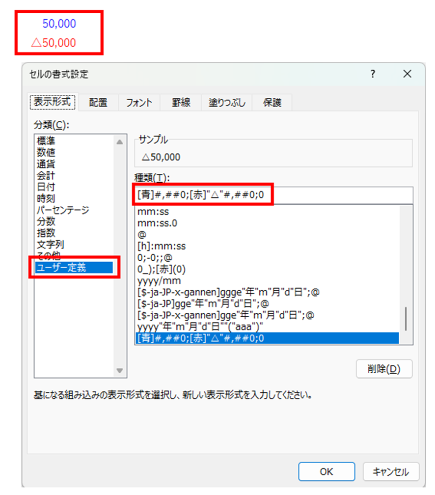 例えば、数値が負の場合に文字色を赤にする条件付き書式を設定し、表示形式はユーザー定義で「△」を付けるといった使い分けが可能です。