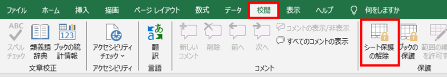 ・シート保護:「校閲」タブで「シート保護の解除」をクリックして保護を解除