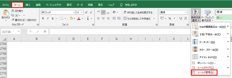 該当するセルを選択して、「ホーム」タブの「条件付き書式」をクリックし、「ルールの管理」を選択します。