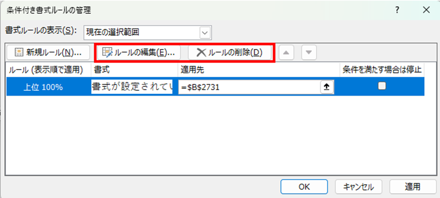 現在設定されている条件付き書式のルールが一覧表示されます。