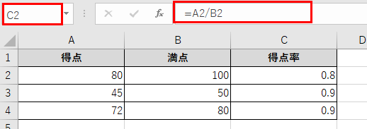 具体的な例として、A列に各科目の得点、B列に満点、C列に得点率(パーセント)を計算する場合を考えてみましょう。