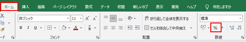 次に、C2セルを選択した状態で、ホームタブの「数値」グループにある「パーセントスタイル」ボタン(%のアイコン)をクリックしましょう。