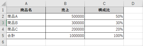 A列に商品名、B列に売上金額、C列に構成比(パーセント)を計算する場合を考えてみましょう。