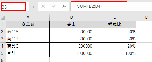 検算のため、C5セルに「=SUM(C2:C4)」と入力して確認してみると良いかもしれません。