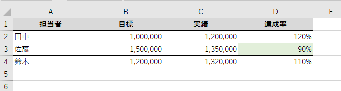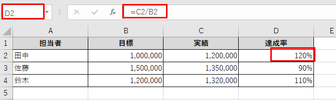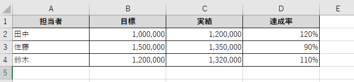 A列に担当者名、B列に目標金額、C列に実績金額、D列に達成率を計算する場合を考えてみましょう。