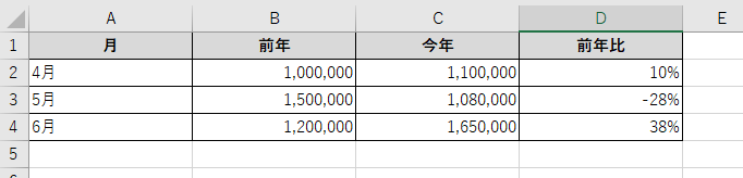 A列に月、B列に前年売上、C列に今年売上、D列に前年比(増減率)を計算する場合を考えてみましょう。
