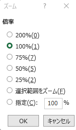 ここで「100%」を選択して「OK」をクリックすれば、表示倍率が100%に設定されます。