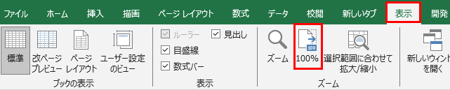 「表示」タブの「ズーム」グループから「100%」ボタンをクリックする方法もあります。
