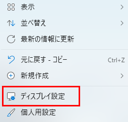 デスクトップの何もない場所で右クリックして、「ディスプレイ設定」を選択します。
