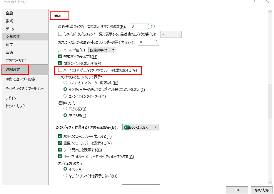 ・エクセルの設定やグラフィック設定:ハードウェアアクセラレーションを無効化し、ウィンドウ枠固定を解除、修復機能を使用