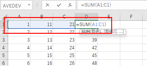 たとえばC1セルに「=A1+B1」という数式が入力されている場合、C1セルをクリックして選択してください。