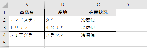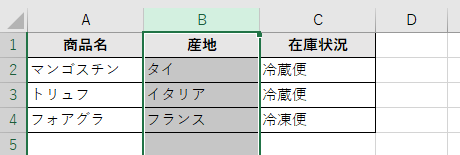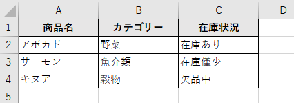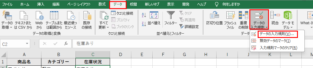 このデータでC列の「在庫状況」にドロップダウンリストが設定されており、これを削除したい場合を考えてみましょう。