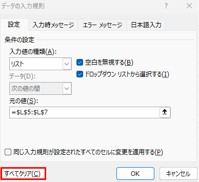 データの入力規則ダイアログで「すべてクリア」→「OK」