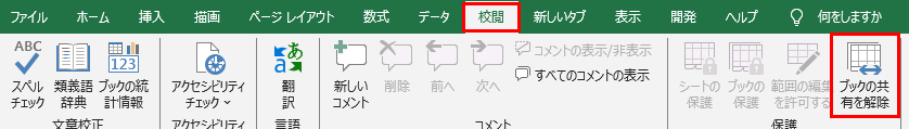 共有ブックが原因の場合は、「校閲」タブから「ブックの共有を解除」をクリックします。