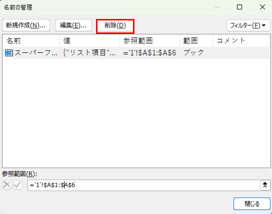 「名前の管理」ダイアログボックスが表示されたら、削除したい名前(例として「スーパーフード」)を選択しましょう。
