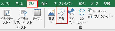 「挿入」タブをクリックして、「図形」ボタンを選択します。