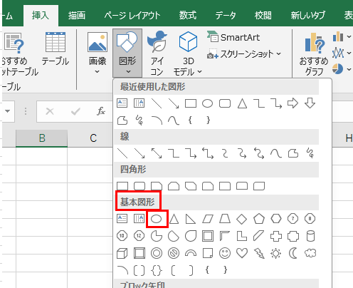 図形の一覧から「基本図形」グループの「楕円」を選択しましょう。