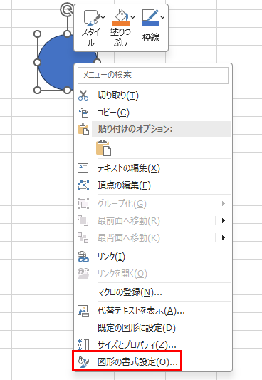 描いた図形は塗りつぶしが設定されているため、中のセルが見えなくなってしまいます。