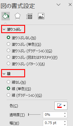 「塗りつぶし」を「塗りつぶしなし」に設定し、「線」の色や太さを調整しましょう。