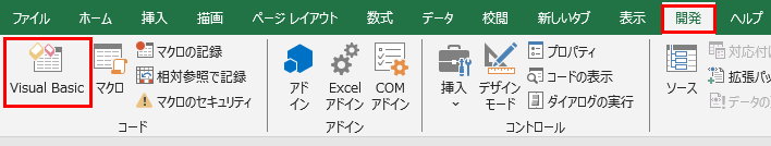 「開発」タブの「Visual Basic」ボタンをクリックして、VBAエディタを開きましょう。