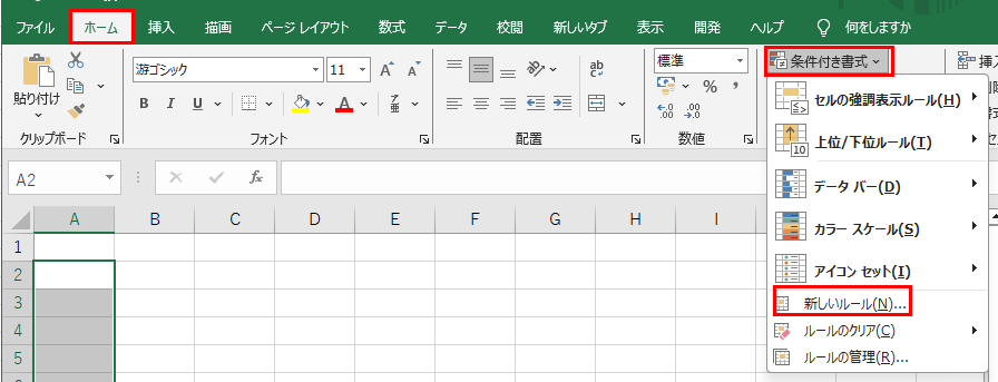 「ホーム」タブの「条件付き書式」をクリックして、「新しいルール」を選択しましょう。