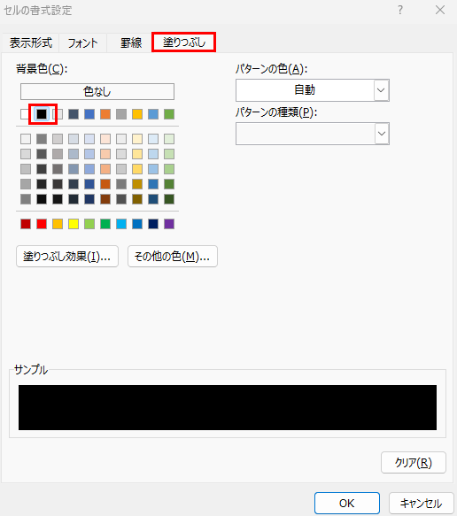 「書式」ボタンをクリックして、「塗りつぶし」タブで背景色を選択してください。