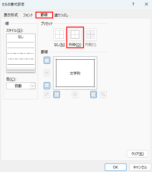 さらに「罫線」タブで、太い外枠線を設定すると丸で囲んだような見た目になります。