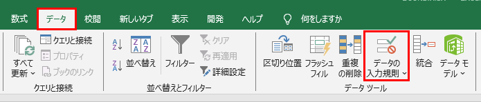 セル範囲を選択して、「データ」タブの「データの入力規則」をクリックします。