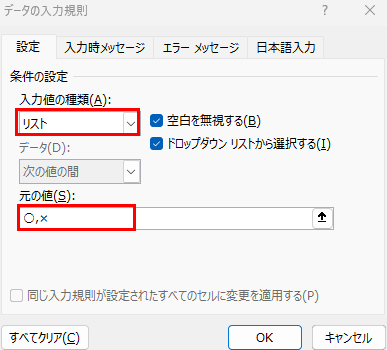 「入力値の種類」を「リスト」に設定し、「元の値」に「○,×」または「○」と入力してください。
