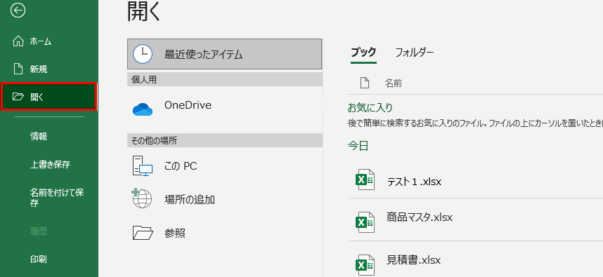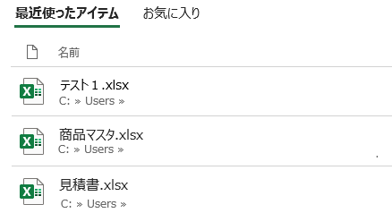 左側のメニューから「開く」を選択すると、右側に「最近使ったアイテム」が表示されます。ここに最近開いたファイルの一覧が表示されるわけです。