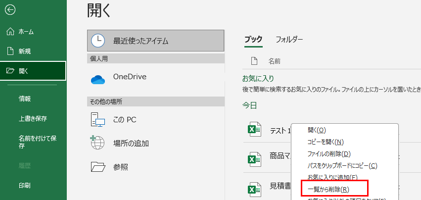 エクセルで最近使ったファイルを個別に削除する方法1【右クリックで履歴から削除】