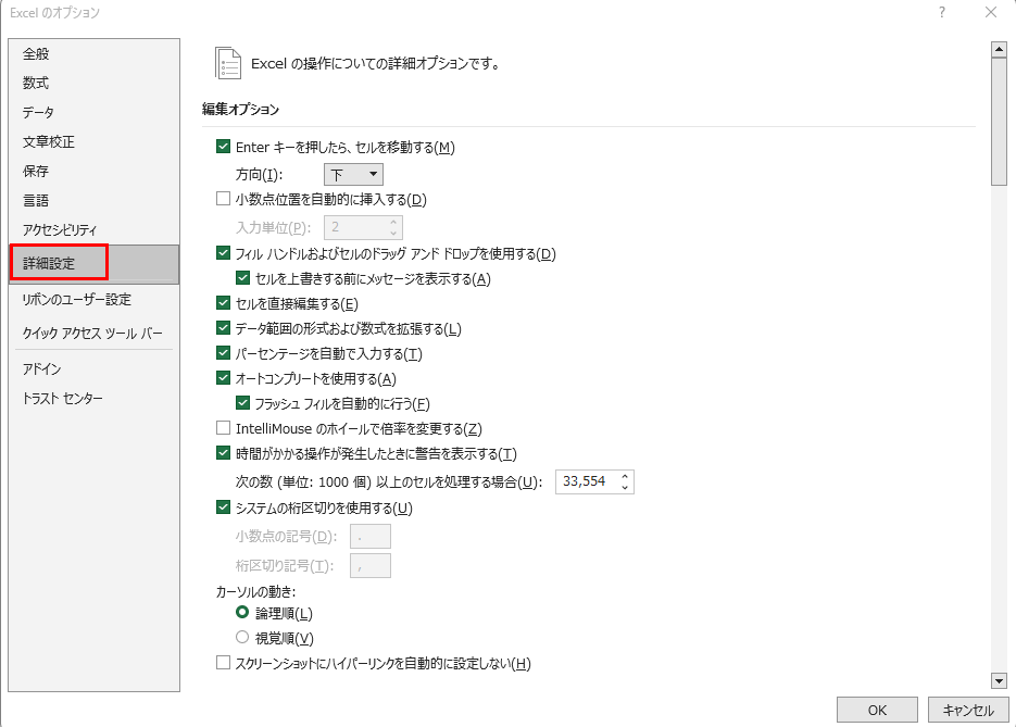 「Excelのオプション」ダイアログが開いたら、左側のメニューから「詳細設定」をクリックしてください。