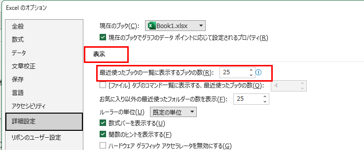 右側の設定項目をスクロールして、「表示」というセクションを探します。その中に「最近使ったブックの一覧に表示するブック数」という項目があります。