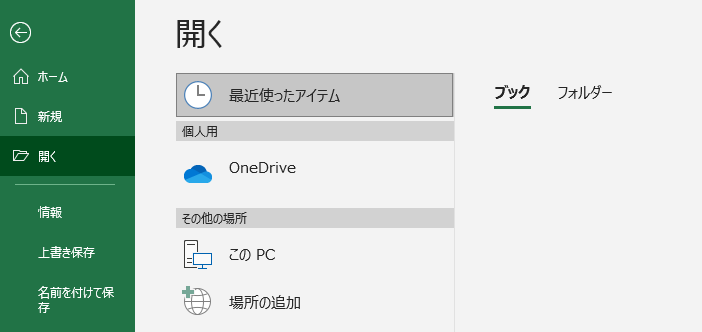 削除後、Excelを再度開いて「ファイル」タブから「開く」を確認すると、最近使ったファイルの一覧が空になっているはずです。