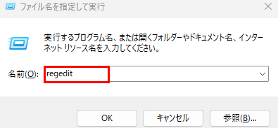 レジストリエディタを開くには、「Windowsキー + R」で「ファイル名を指定して実行」を開き、以下を入力して「OK」をクリックします。