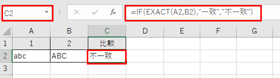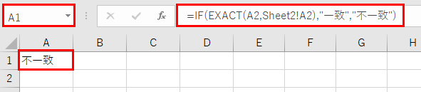 =IF(EXACT(A2,Sheet2!A2),”一致”,”不一致”)