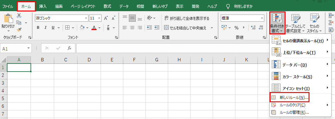 「ホーム」タブから「条件付き書式」を選択し、「新しいルール」をクリックします。