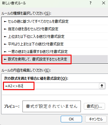 この数式は「A列とB列の値が一致しない場合」という条件を表しています。