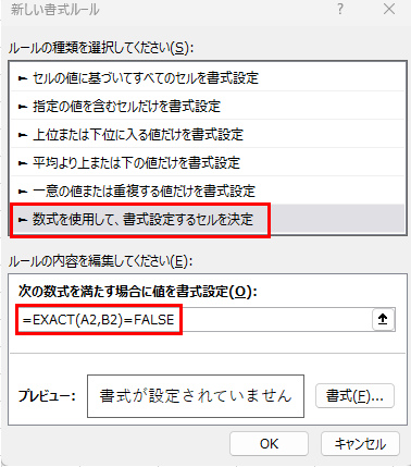 より厳密に文字列を比較したい場合は、数式を =EXACT(A2,B2)=FALSE とすることで、大文字小文字の違いも検出できるます。