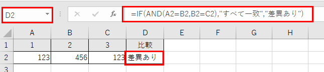 =IF(AND(A2=B2,B2=C2),”すべて一致”,”差異あり”)