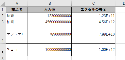 エクセルに大きな数字を入力すると「1.23E+11」のような表示に自動的に切り替わることがあります。